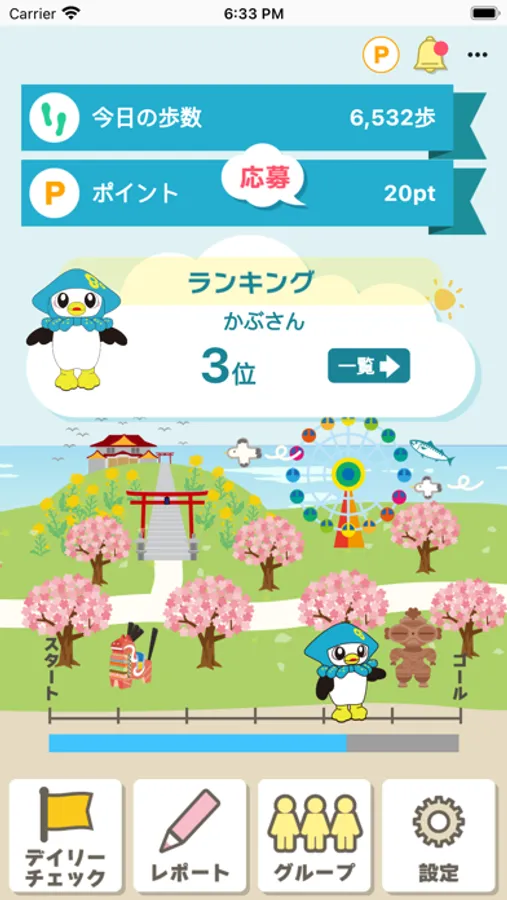 日、週、月、累計の歩数を集計して指定の歩数に到達するとポイントが獲得できます。