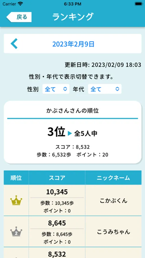 アプリ利用ユーザ同士の歩数とポイント合計値のランキングが表示されます。