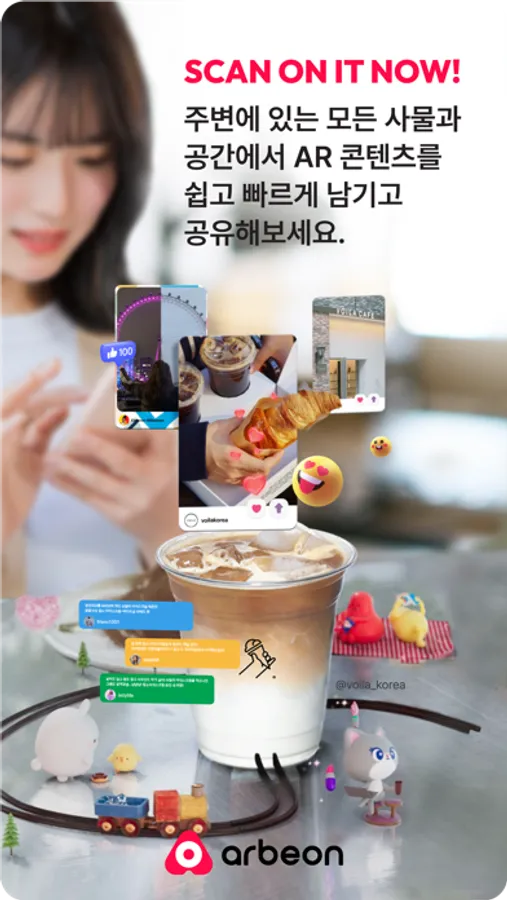 이제 당신 앞에 놓인 모든 사물과 공간은 나의 관심사, 여러 사람의 감상이 어우러진 또 하나의 새로운 소통의 장이 됩니다. 이제껏 없던 새로운 소통 방식을 제공하는 arbeon은 전 세계 사용자 모두의 일상을 더욱 실감나게, 보다 풍성하게 만듭니다.