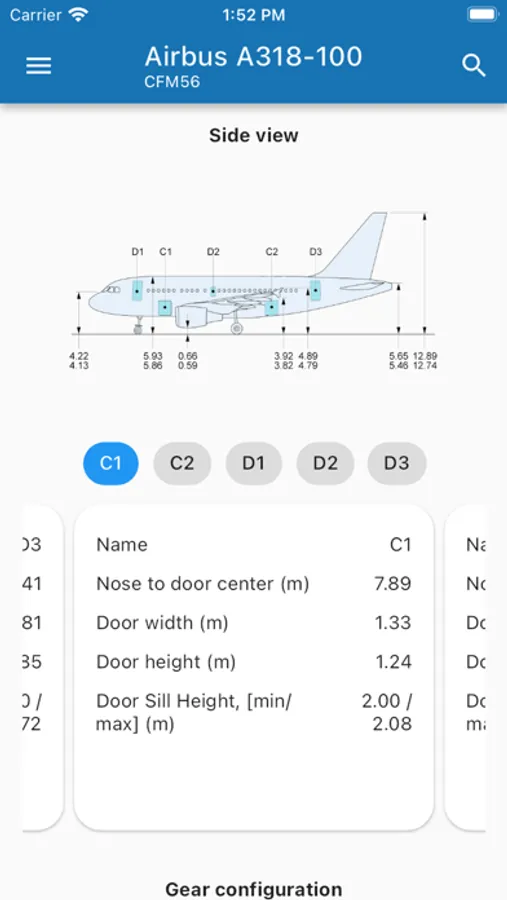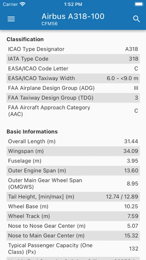The AircraftData app provides data as well as technical views of common aircraft types, such as type codes, length, wingspan, height, clearances, door arrangement, landing gear footprint, exhaust velocities, service arrangement etc., if available.