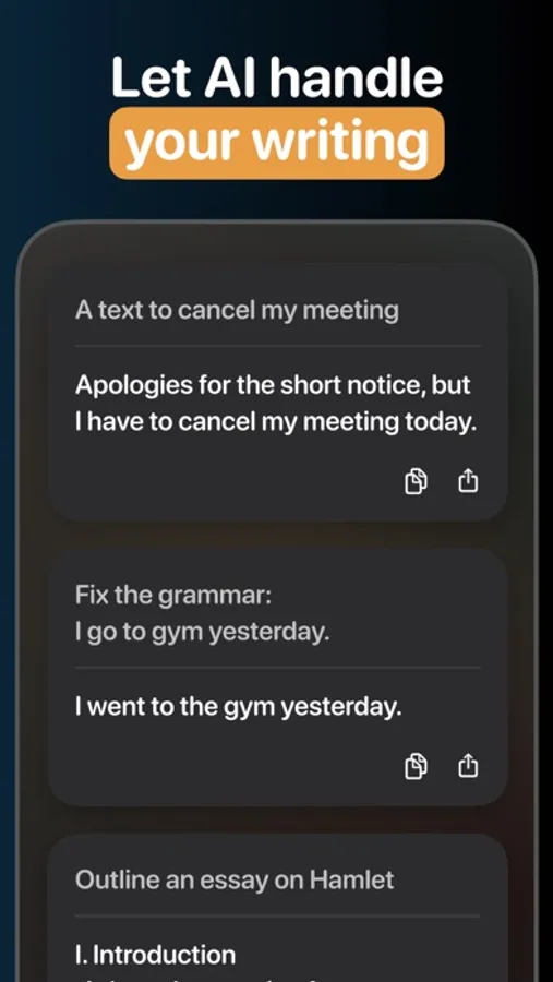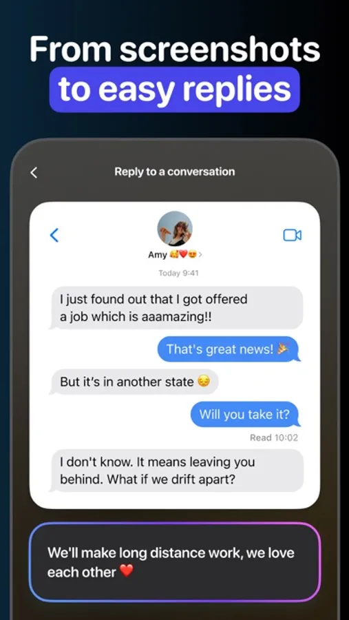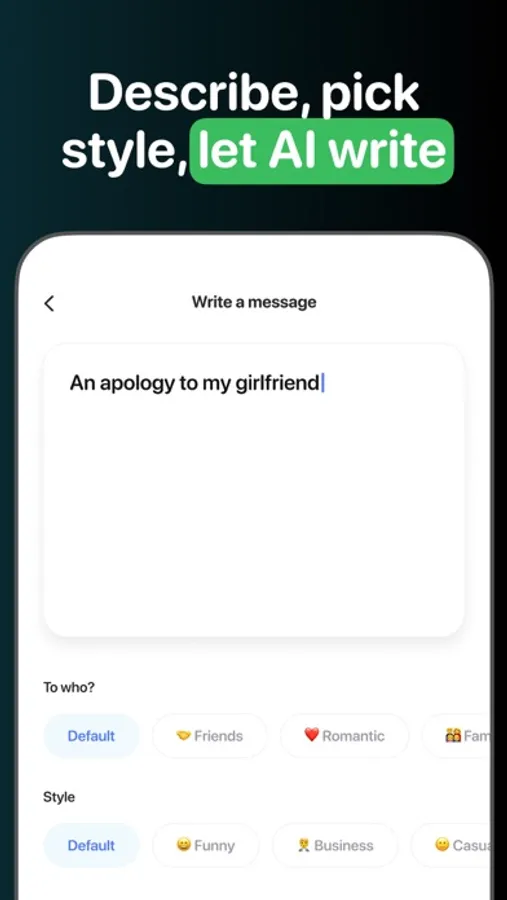 TextAI takes the stress and effort out of messaging and writing - generating engaging and appropriate messages and texts that are tailored to your needs. Whether you're trying to impress your crush, apologize to a friend, or handle a difficult conversation with grace, our app has got you covered.