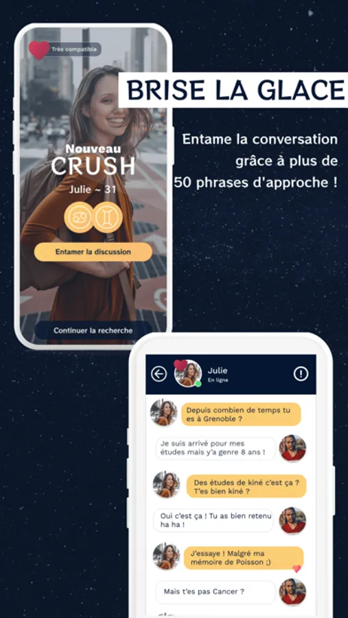 Fais défiler les profils et choisis avec lesquels tu voudrais discuter. Si un autre utilisateur souhaite aussi apprendre à te connaître, c’est le crush ! Rendez-vous dans le chat pour faire connaissance (et qui sait, tomber amoureux). Un coup de cœur pour un profil ? Envoie lui un “Kosmic Crush” pour lui montrer ton intérêt.