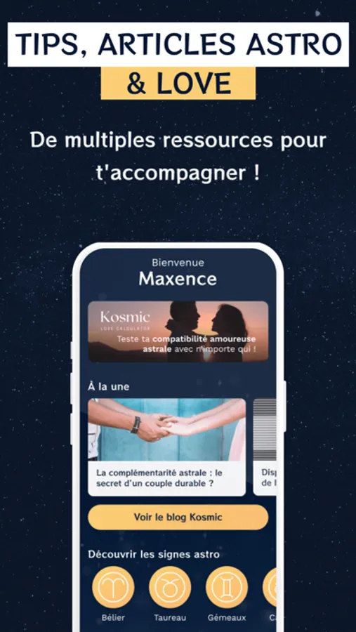 Tu voudrais en savoir plus sur ton profil astral ou l’astrologie de manière générale ? La Home de l’application t’offre de nombreuses ressources à découvrir pour en apprendre plus sur les signes astrologiques, le thème astral, la compatibilité amoureuse en astrologie etc.
