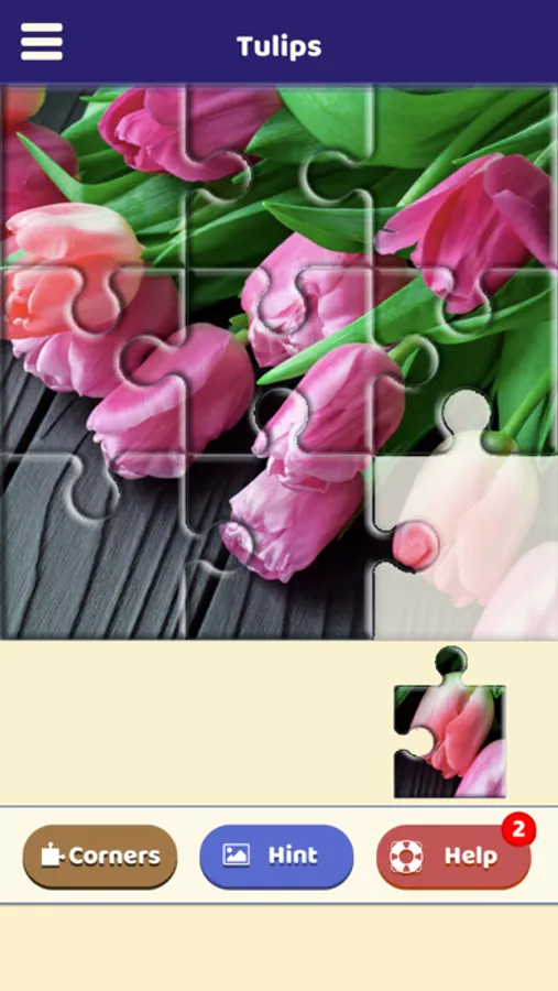 If you're stuck you can use "Hint" to have a glimpse of the picture or use "Help" to locate one piece.
