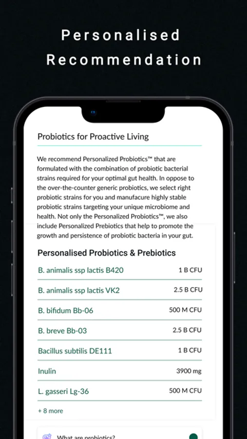 Genofax™ recommends Personalized Probiotics™ that are formulated with the combination of probiotic bacterial strains required for your optimal gut health. In contrast to the over-the-counter generic probiotics, Genofax’s recommendation algorithm selects right probiotic strains for you and then Genofax™ manufactures highly stable probiotic strains targeting your unique microbiome and health. Not only the Personalized Probiotics™, Genofax™ also includes Personalized Prebiotics that help to promote the growth and persistence of probiotic bacteria in your gut.