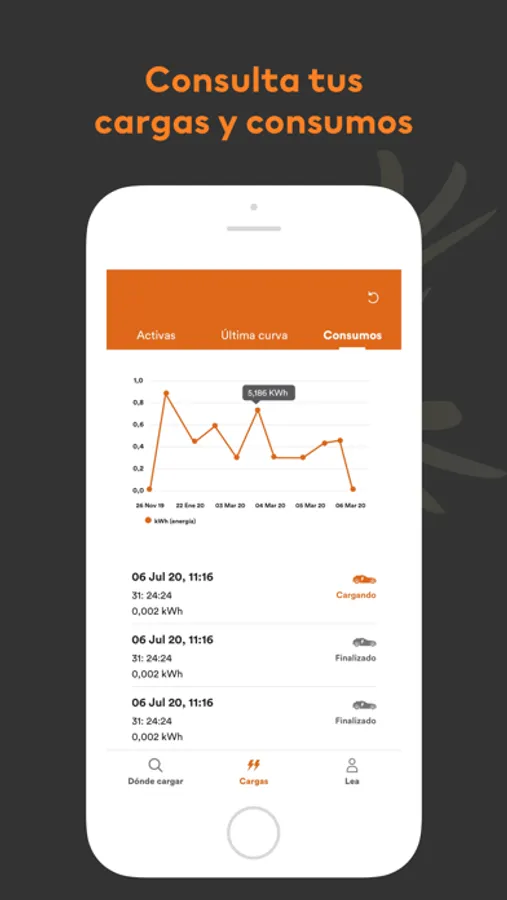 Desde tu App podrás recargar vehículo eléctrico cómodamente, te notificaremos cuando la carga haya finalizado y consultar los últimos consumos realizados y la última curva de recarga.
