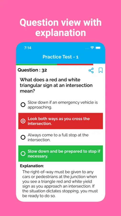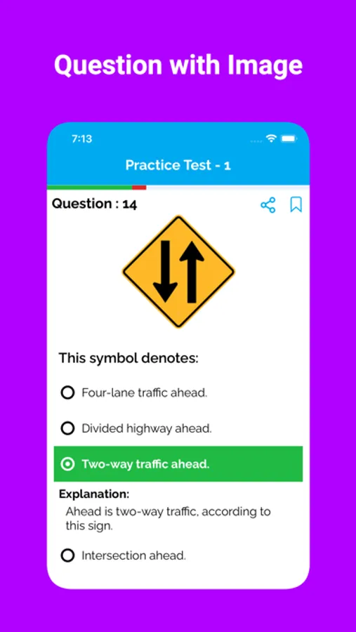 Our app includes a variety of practice questions for the Driver's license exam for Car, Motorcycle and Commercial Vehicles. These questions are based on the official handbook of different states.