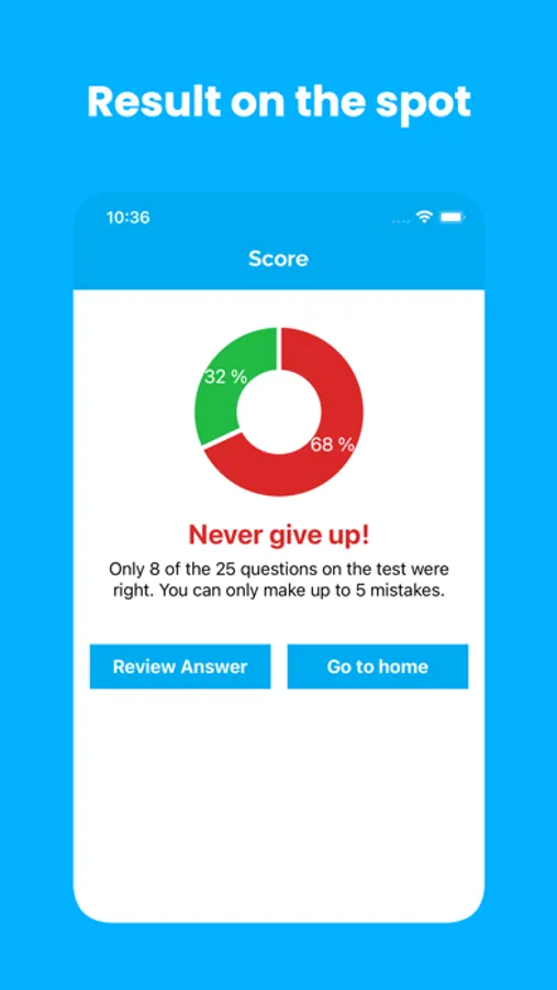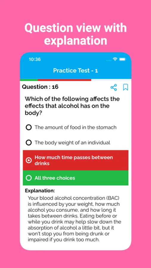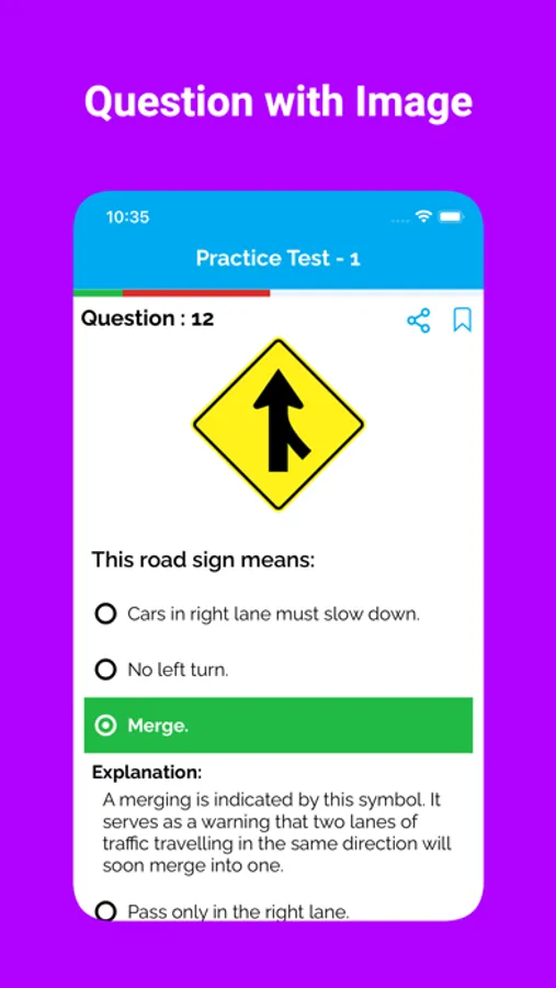Our app includes a variety of practice questions for the Driver's license exam for Car, Motorcycle and Commercial Vehicles. These questions are based on the official handbook of different states.