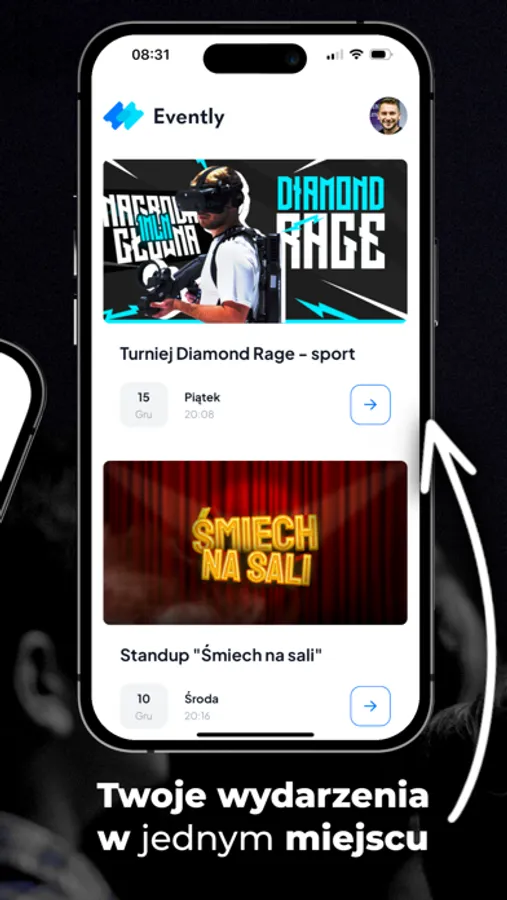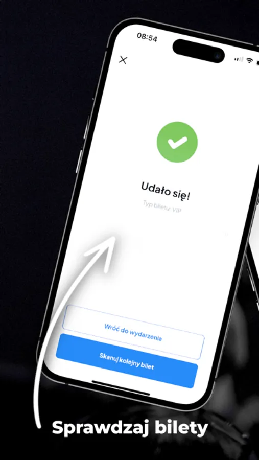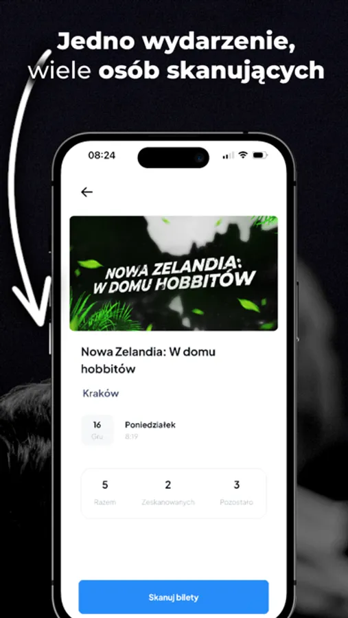 Aplikacja pozwala na wybranie właściwego wydarzenia z kontrolą wejścia, wystarczy aby użytkownik pokazał bilet na swoim urządzeniu a Ty przy pomocy skanera sprawdzisz ważność biletu.