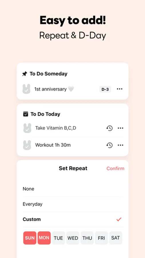 Set a reminder for the task you should not miss. Todac sends an alarm when the set time comes.