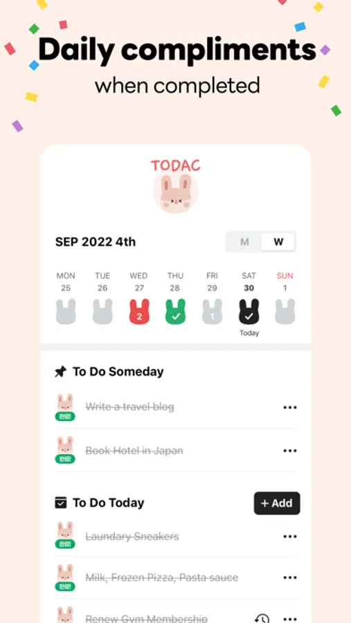 When you complete all of your daily tasks, cute todac will show up and give you compliments.