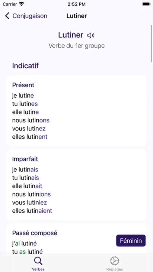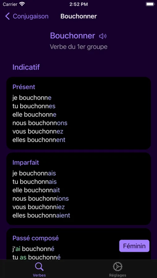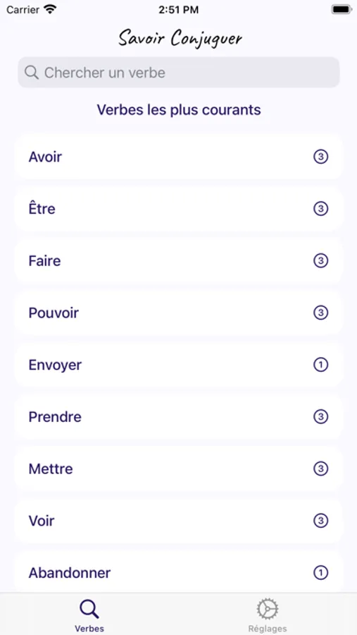 Savoir Conjuguer gives you access to conjugation of thousands of French verbs. You'll find the classic and pronominal forms of verbs, auxiliaries and the feminine form.