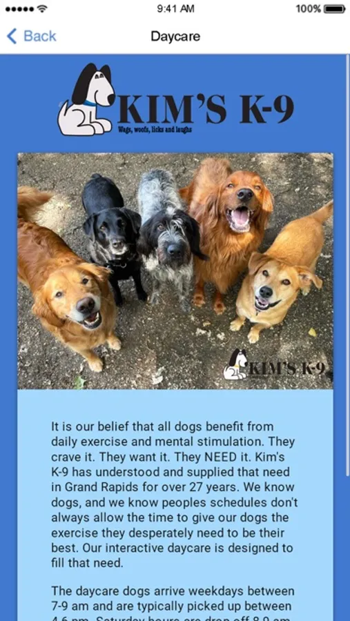 Kim’s K-9 staff members are fully trained to take the best possible care of your dog. They adore interacting with the dogs as they run, jump, and play with friends. Dogs are sure to have a great time and return home tired from all the activity.