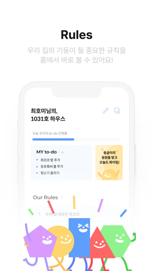 함께하는 공간을 지키고 서로를 배려하는 우리만의 규칙을 정해 중요한 규칙들을 홈 화면에 띄워볼 수 있어요. 룸메이트에게 보내는 깜짝 메시지를 적어보는 것도 하나의 즐거움이 될 거예요 :)
