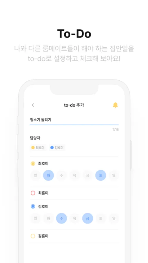 나와 다른 룸메이트들이 해야 하는 집안일을 to-do에 담아 하나하나 체크해 보아요! 우리 집의 to-do가 체크될 때마다 진행도를 확인할 수 있어요~