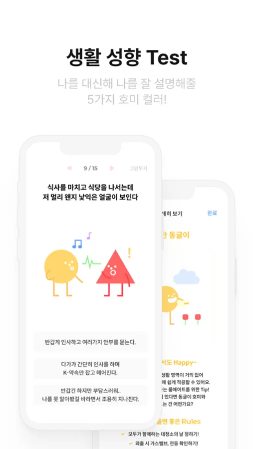15 문항으로 이루어진 생활 성향 테스트. 생활 성향 테스트를 진행한 호미들에게는 5가지 알록달록한 호미 컬러가 준비되어 있어요! 테스트를 통해 그려진 나만의 오각형 그래프는 나를 대신해 나를 잘 설명해 줄 거예요~