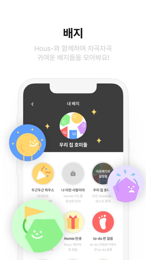 Hous-에서 룸메이트들과 성향 테스트를 참여하고, Rules와 to-do를 만들어 지키며 귀여운 배지들을 모아봐요! 내가 받은 다양한 배지들 중 내 대표 배지를 선택해 룸메이트들에게 공유할 수도 있어요~