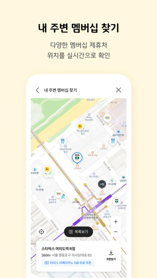 - 멤버십 혜택을 놓치지않도록 내가 받을 수 있는 혜택들과 가까운 멤버십 제휴처를 확인할 수 있어요.