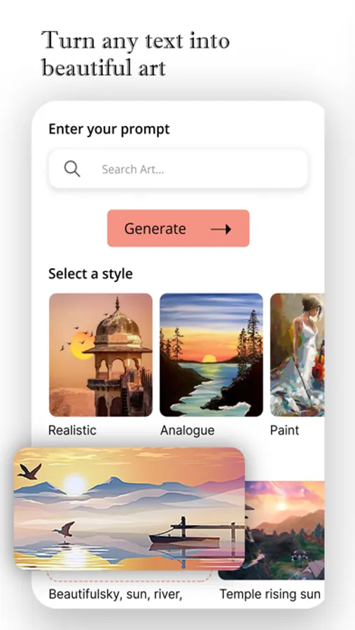 This art generator creates unique paintings based on text prompts. Forget about the struggles of hiking through the web in search of the image or the art supplies you would need to make your own design. All you need to do is to describe your idea, and the AI painter will take care of the rest!Want to see a BBQ party on Mars or a group of cats having a tea ceremony? Or maybe you're wondering what lies in the far corners of our universe? AI Art can show you all that and more! Trained with millions of images from the web, this powerful AI image generator will transform any dream into visual art in a matter of seconds! Simply type in what you have on your mind, and the art generator will create the art that has never been seen before using the power of artificial intelligence.