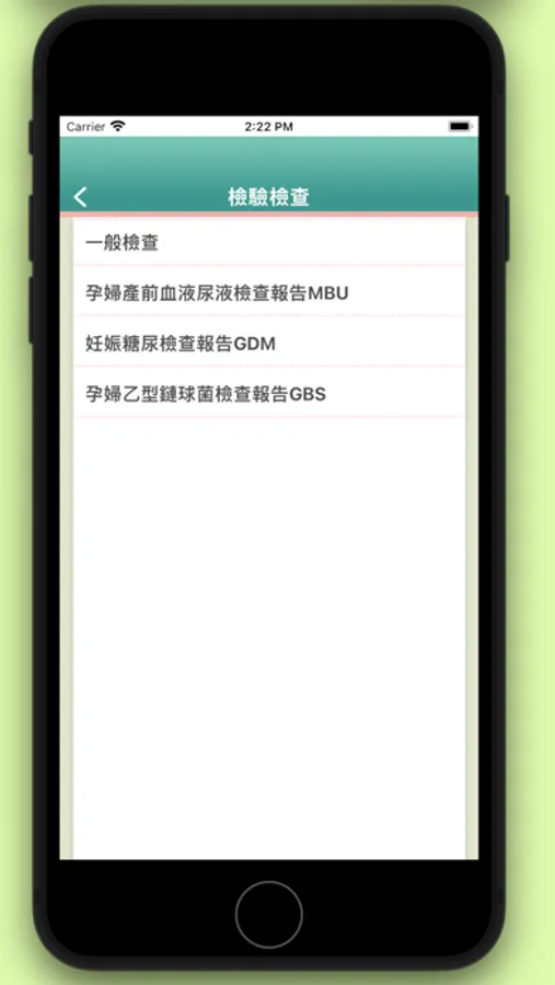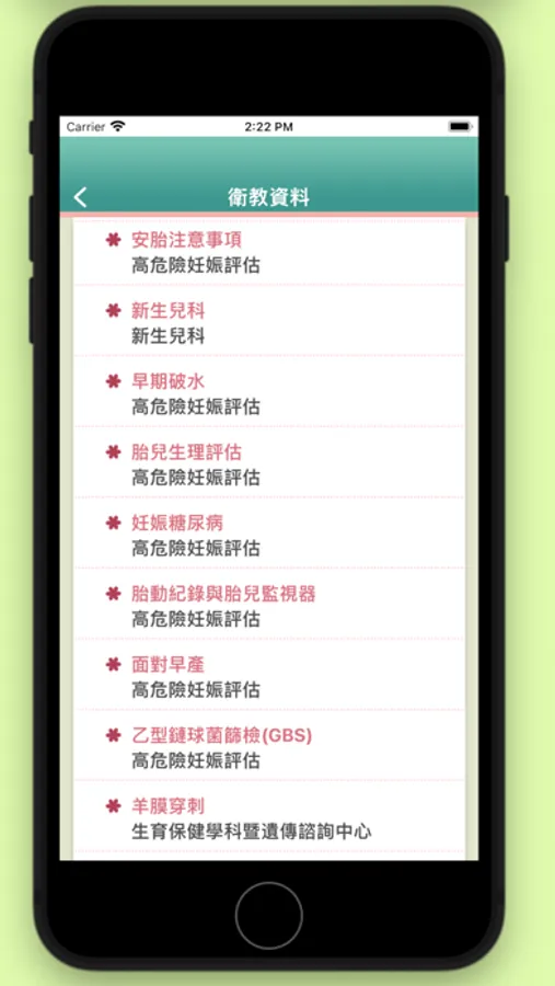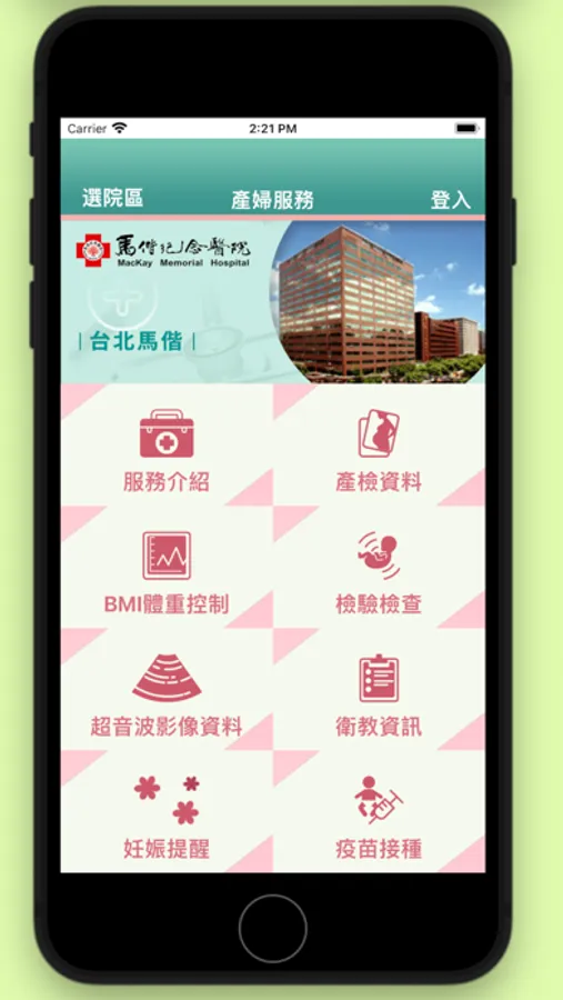 包含 :服務介紹、查詢產檢資料、BMI體重控制、檢驗檢查、超音波影像資料、衛教資料、妊娠提醒和疫苗接種資訊。