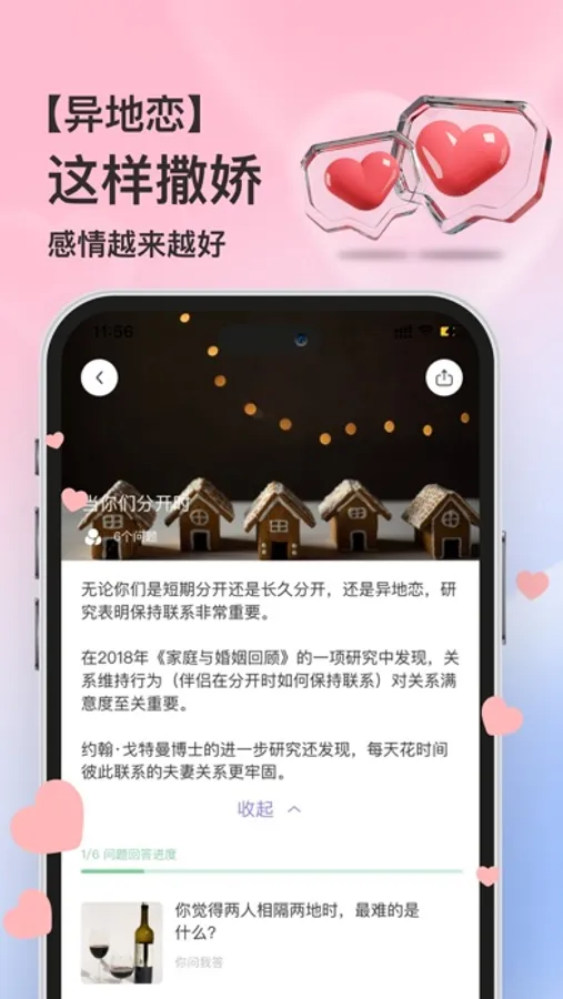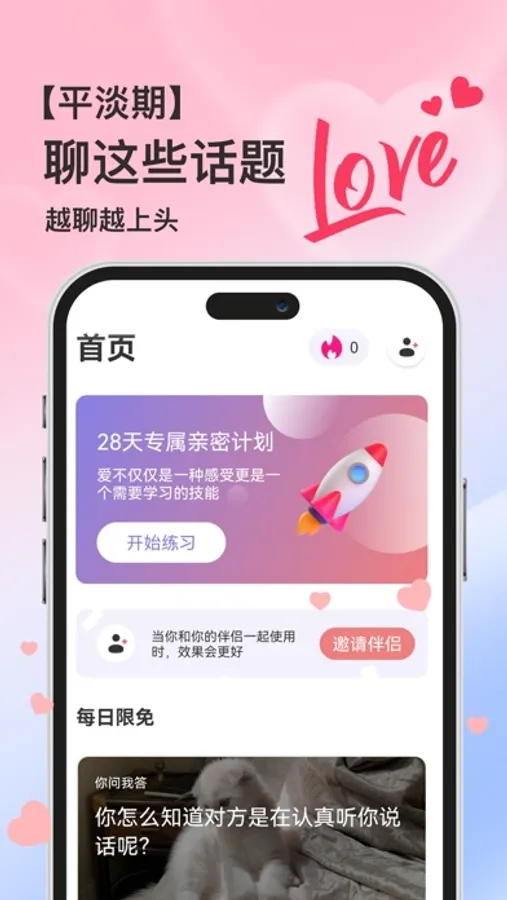 -每日问题:基于心理研究,由我们顶级伴侣治疗师和学者精心创建的情感问题,助力你们解锁恋爱密码,助力爱情长跑,给彼此稳定的安全感。