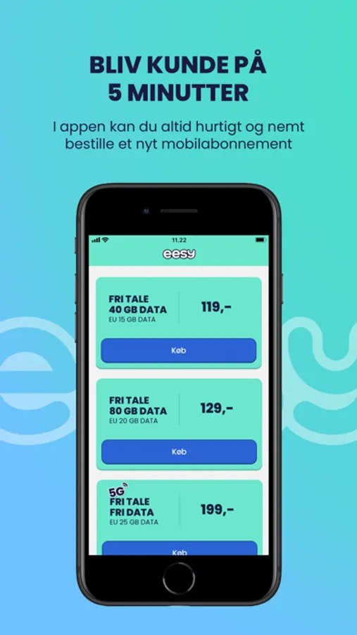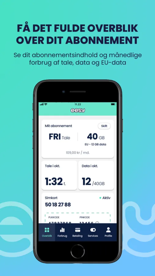 I eesy app’en kan du nemt og hurtigt købe et mobilabonnement, men det er også den hurtigste vej til at finde info om dit abonnement, forbrug og kvitteringer samt services til nemt at tage styringen over dit mobilabonnement. Som eesy-kunde logger du ind med kode første gang, og herefter med Face ID eller fingeraftryk for hurtig adgang. Det synes vi selv er rimelig eesy.