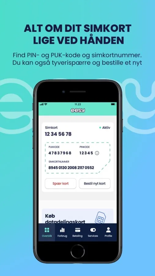 - Find alle detaljer om dit simkort: Både PIN- og PUK-kode og simkortnummer.