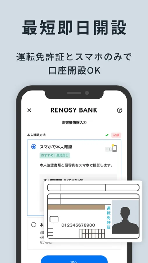 ・運転免許証をお持ちのかたは、スマホで本人確認を行うことで、最短即日に口座開設できます。