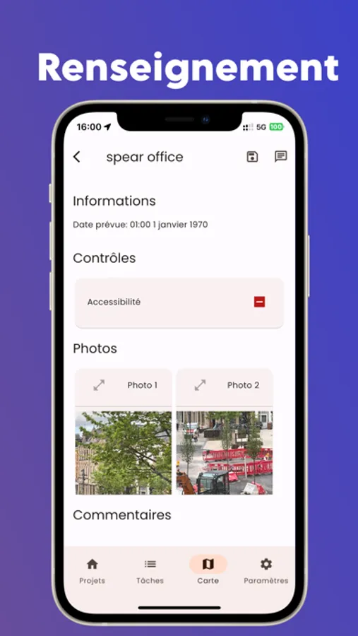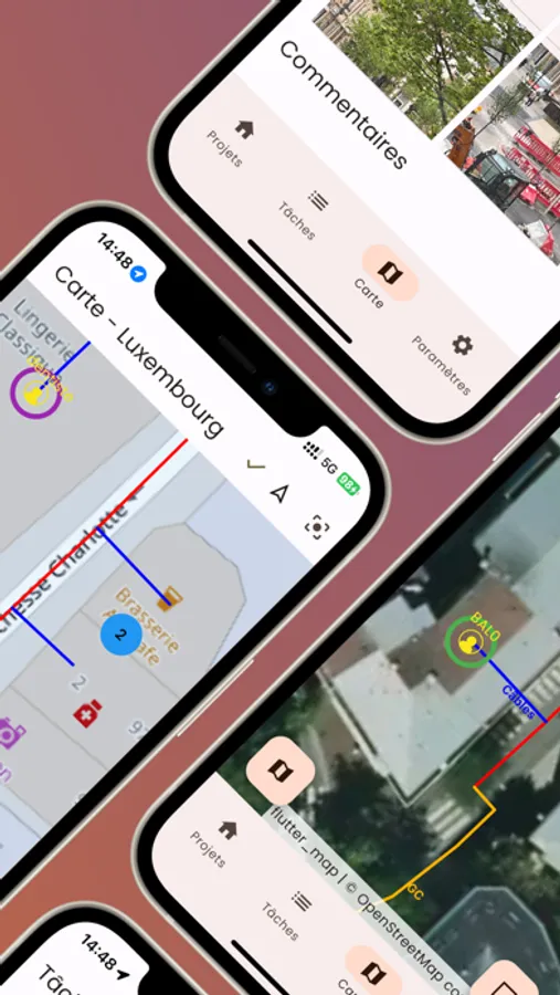 Drawn lines and points can contain photos and custom properties. Items displayed on the map are customizable to adjust their visibility. Your data is automatically synchronized with your design office through the cloud.