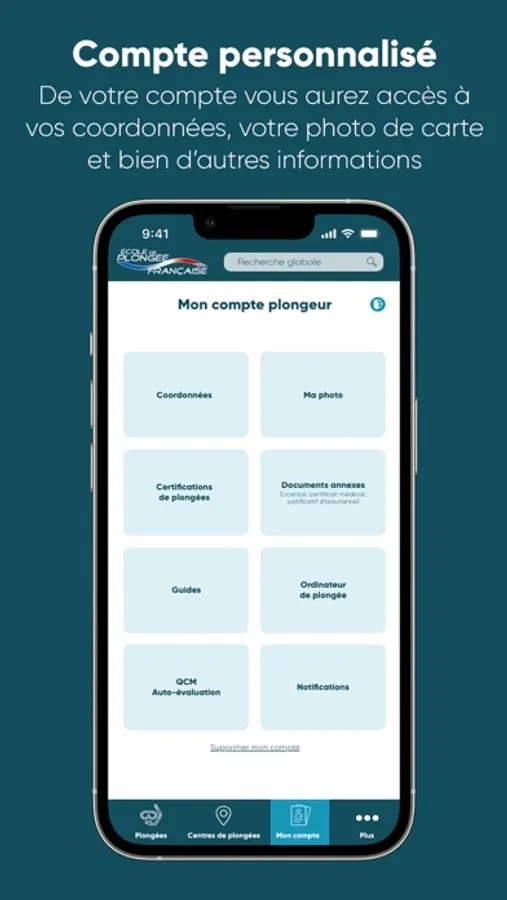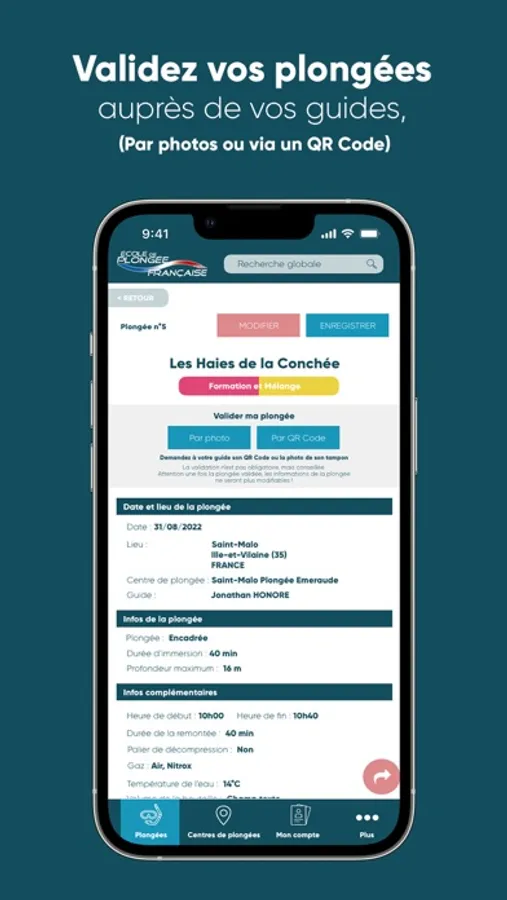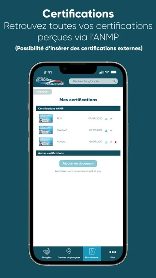 Combinant les fonctions de carnet de plongée et de « portefeuille numérique », vous pourrez y enregistrer toutes vos plongées avec photos et y stocker tous vos niveaux de plongée délivrés par l'ANMP, ou par n'importe quel organisme français ou étranger.
