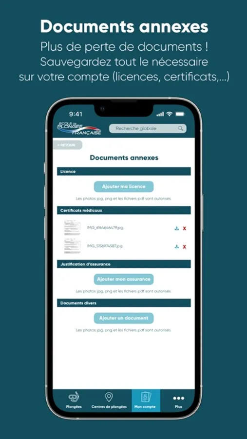 Votre "portefeuille numérique" vous permettra de stocker vos documents annexes comme le certificat médical, l'attestation d’assurance, une licence, etc…