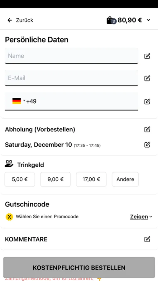 - Durchsuchen Sie die Speisekarte des Restaurants und sehen Sie sich alle anpassbaren Optionen im Voraus an