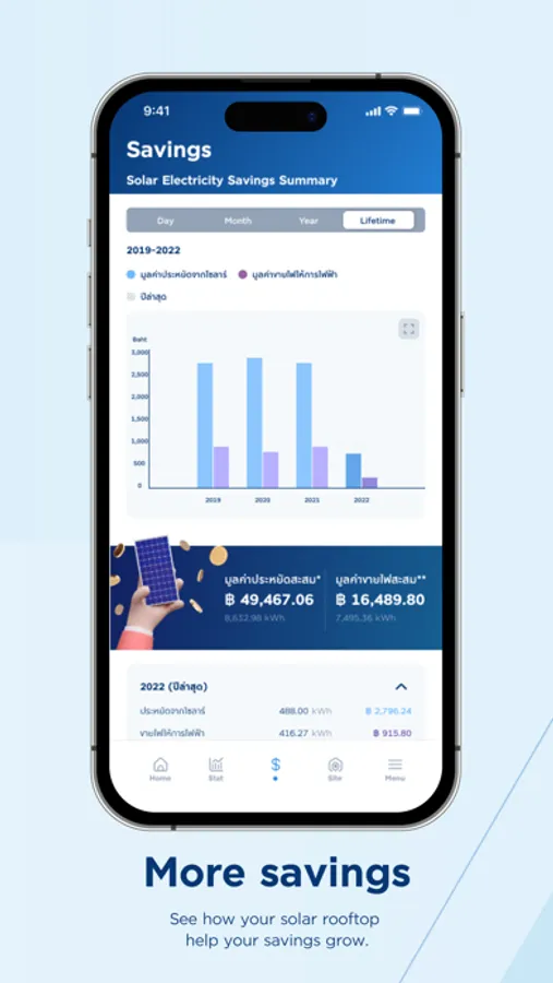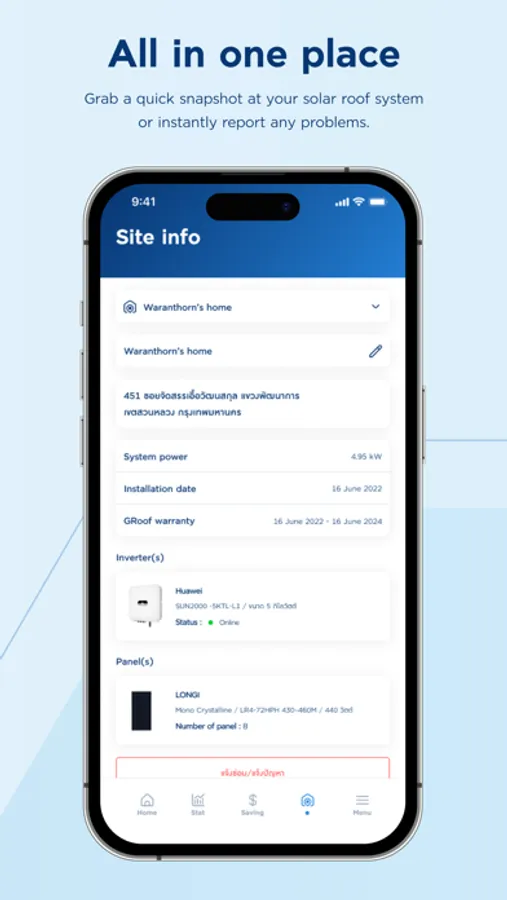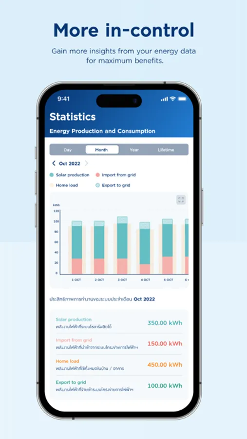 Begin your clean energy journey with an easy-to-use solar rooftop application that allows you to learn more about how the system is performing, how much your savings are, and how you can help the environment. Application also provides you with an in-depth analysis of the power production/consumption over a chosen period and keep track of all your documents for maintenance purposes.