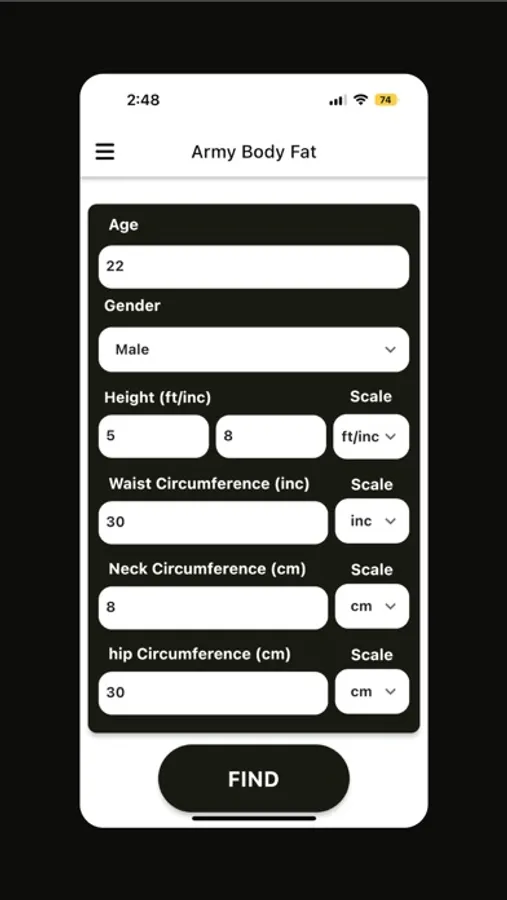 It is a simple app to calculate the estimated body fat of army male and female soldiers. Insert the correct size of your hip, neck, waist, and height and get results in no time with this calculator.