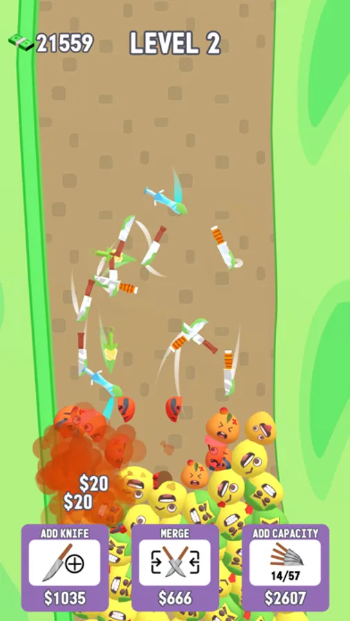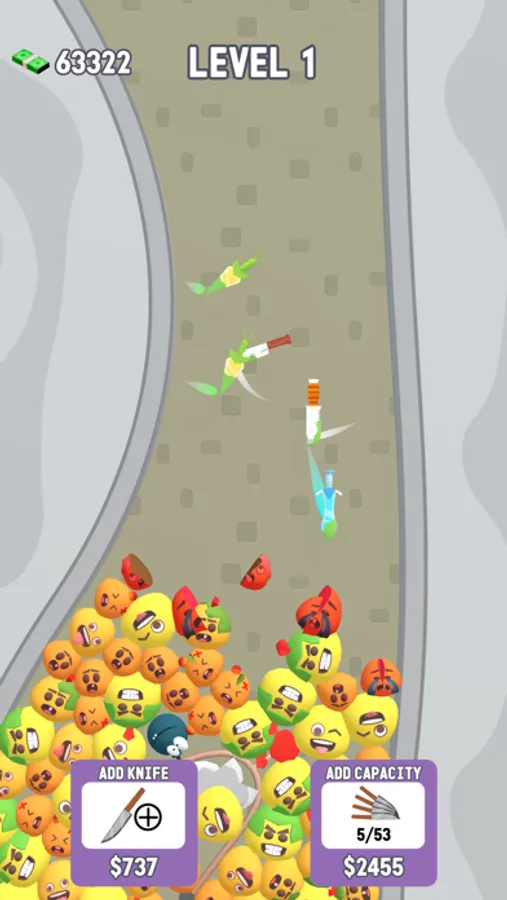 Add knives and merge them to make sharper. Pop the colorful and funny emojis. Don't miss the useful bombs to pop more.