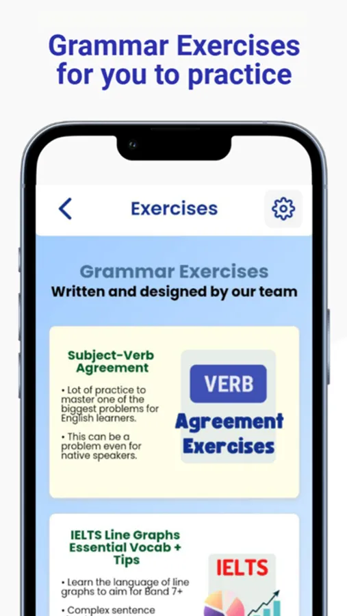 The app has many free grammar exercises (added weekly) which are created by our team. In addition, the app also has an 'IELTS Essay Correction Service' which is run by ex-British Council teachers. Try 'English Teacher Live' today and get lots of practice and high quality learning materials.