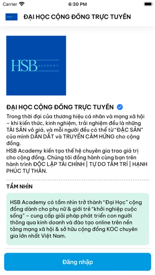 HSB Academy có tầm nhìn trở thành “Đại Học” cộng đồng dành cho phụ nữ & giới trẻ “khởi nghiệp cuộc sống” – cung cấp giải pháp phát triển con người thông qua kinh doanh và đào tạo online trên nền tảng mạng xã hội & sở hữu cộng đồng KOC chuyên gia lớn nhất Việt Nam.