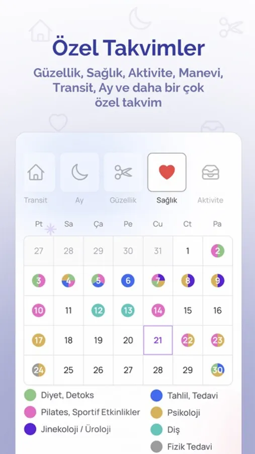 - Special calendars (moon, health, beauty, activities, official affairs, and spiritual calendar)