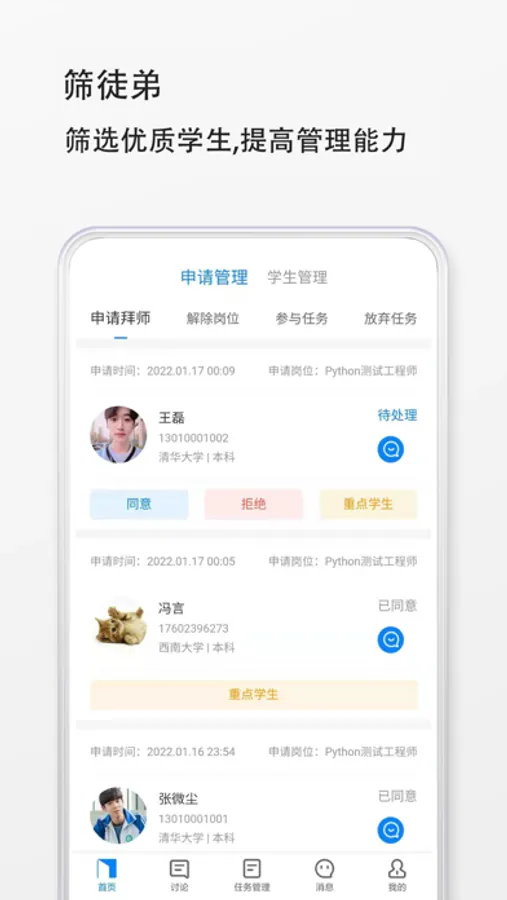 筛选一个申请拜师的学生当徒弟,分一些工作任务给学生,学生一边做任务一边学习,减轻自己工作压力的同时,给企业培养人才,帮助学生成长。