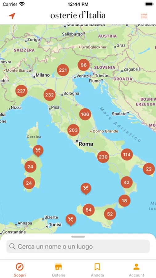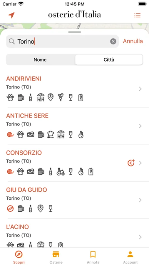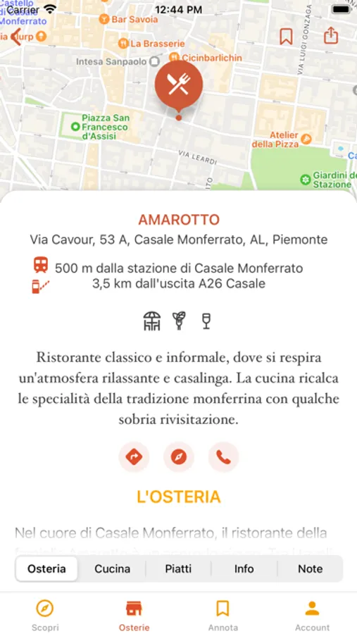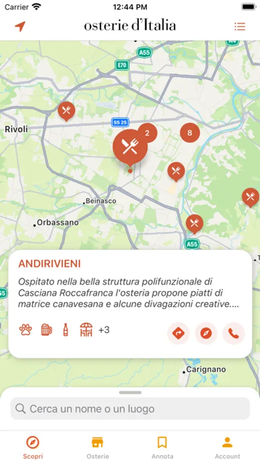Indicazioni e filtri segnalano le osterie vicine a una stazione ferroviaria o a un casello autostradale.