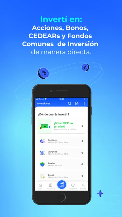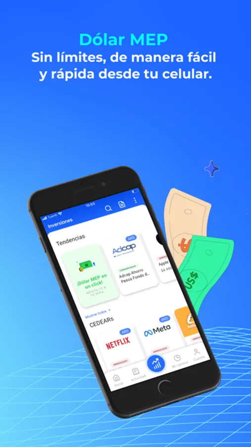 Comprá dólar MEP en un click. Invertí en acciones, bonos, CEDEARs y Fondos Comunes de Inversión.