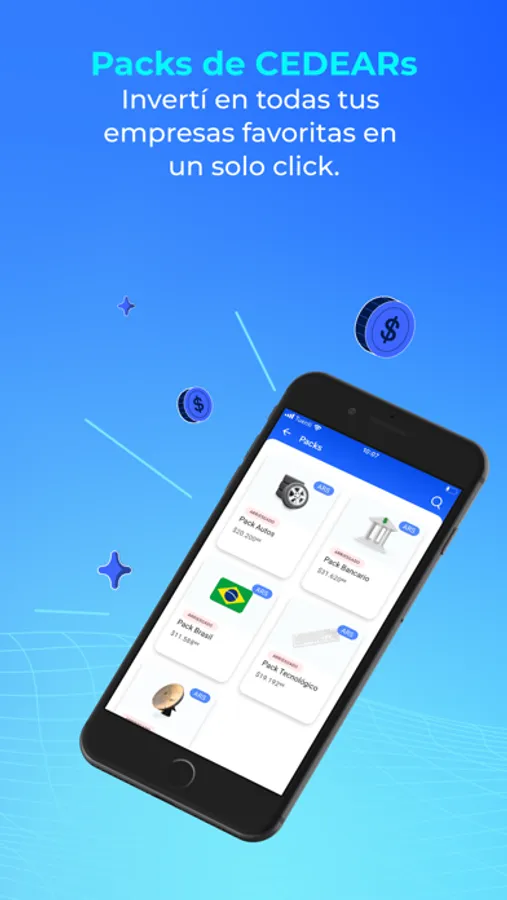 * Operar packs de CEDEARs para que puedas invertir en todas tus empresas favoritas como Coca-Cola, Apple, Disney y muchas más.