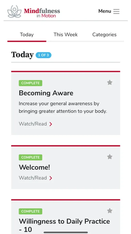 The Mindfulness in Motion app will enhance your experience with mindfulness by providing on-the-go practices and reminders to truly be in the present moment. Start the program by establishing a baseline through a pre-program survey. Allow yourself to supplement your weekly session by choosing from over 20 practices and readings each week that focus on the theme of the week. Then, apply all that you have learned by answering a weekly reflection question that relates to the topic of the week. At the conclusion of the program, answer a post-program survey that reflects on your personal progress and the program as a whole.