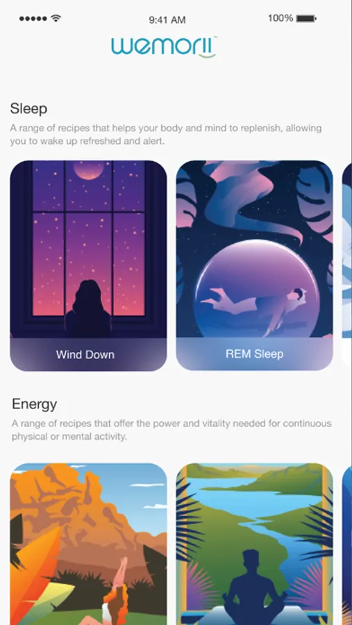 The Wemorii One Home App allows you to create a customized wellness experience tailored to your unique needs and lifestyle. Choose from 24 expertly-crafted recipes across four categories – Sleep, Energy, Immunity, and Stress Relief – to find the perfect blend for any moment. Whether you're looking to unwind after a busy day, boost your morning energy, or strengthen your immune system, our app has got you covered.