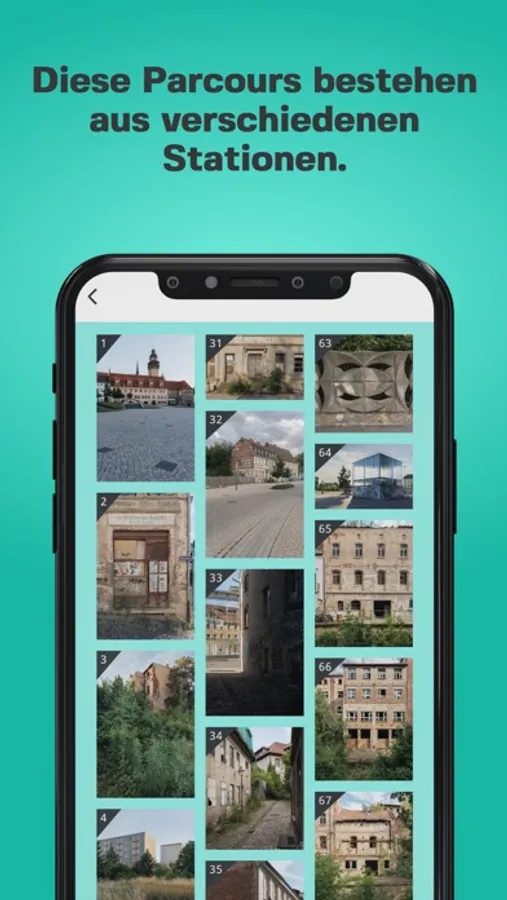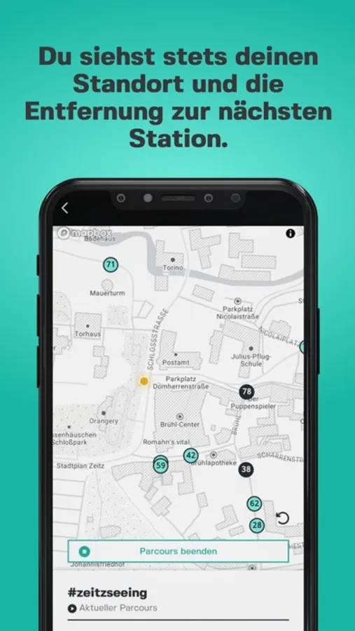 Die interaktive Karte führt dich zu den Stationen, die automatisch freigeschaltet werden, sobald du in ihrer Nähe bist. Du kannst Bilder und Texte zu jeder Station sehen. Beim ersten Parcours #zeitzseeing kannst du nach fünf besuchten Stationen digitale Ansichtskarten verschicken.
