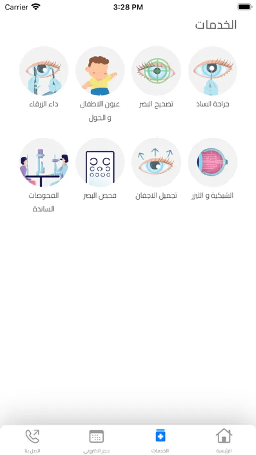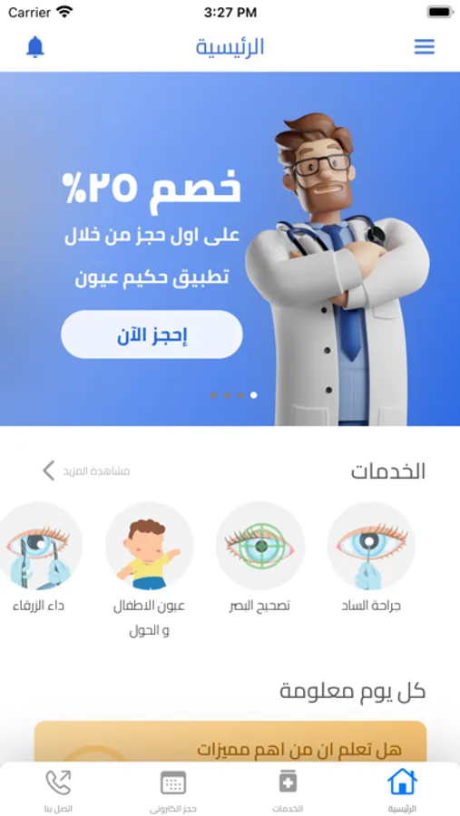 تطبيق حكيم عيون يوفر معلومات عامة و ثقافية عن العناية بالعين و كما انه يتيح للمراجعين عملية الحجز الالكتروني من خلال امهر الاطباء في المركز.