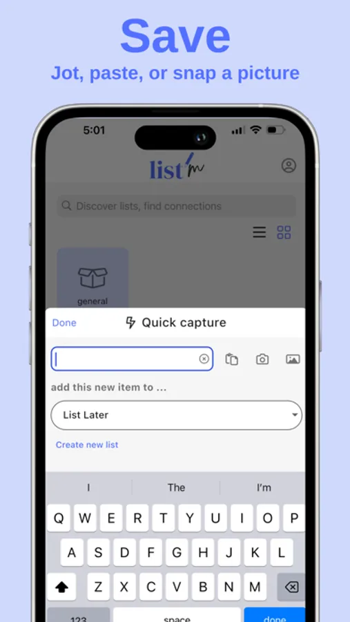 Record something in seconds by jotting it down, snapping a picture, or pasting a link. Stick it in a folder (immediately, or later when you have the chance), and it will always be there waiting for you. List’m saves you time when you record an item and even more time when you go to retrieve it later.