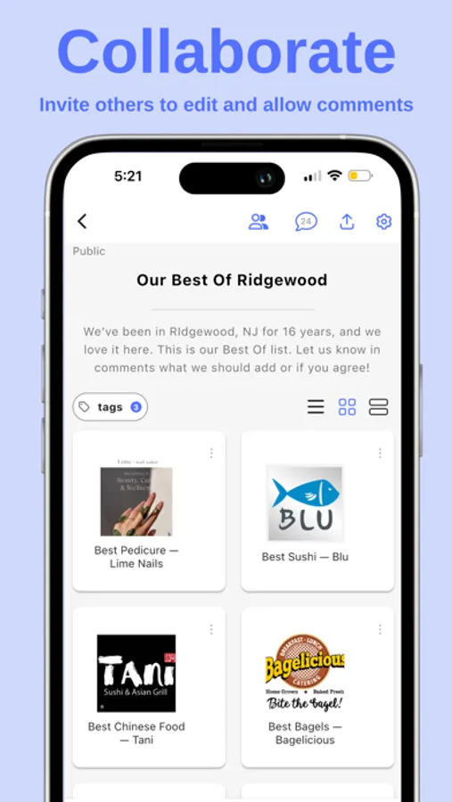 Lists can be private, shared with a small group, shared with all of your connections, or shared with every Lister. We all can have some influence, and now you can share what you know and love no matter the size of your following. Engage with your community in real time when you allow comments on a list. Benefit from the experiences and recommendations of other Listers by following lists you care about. Save. Search. Share.