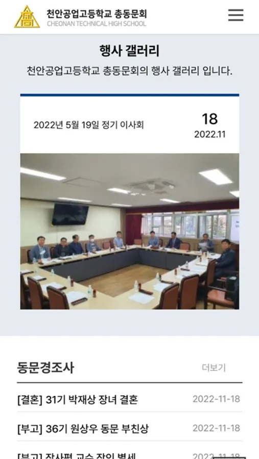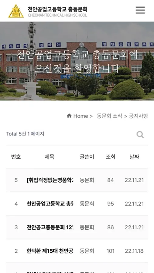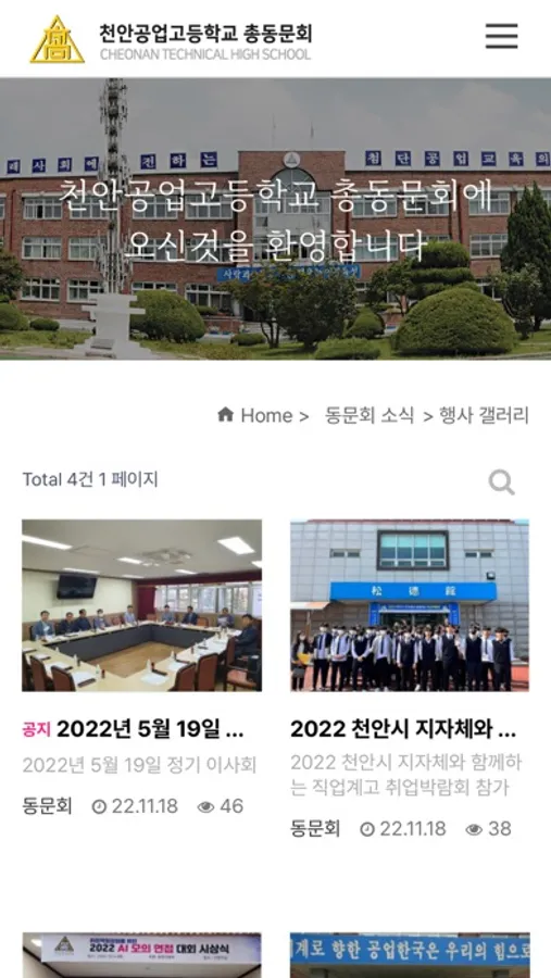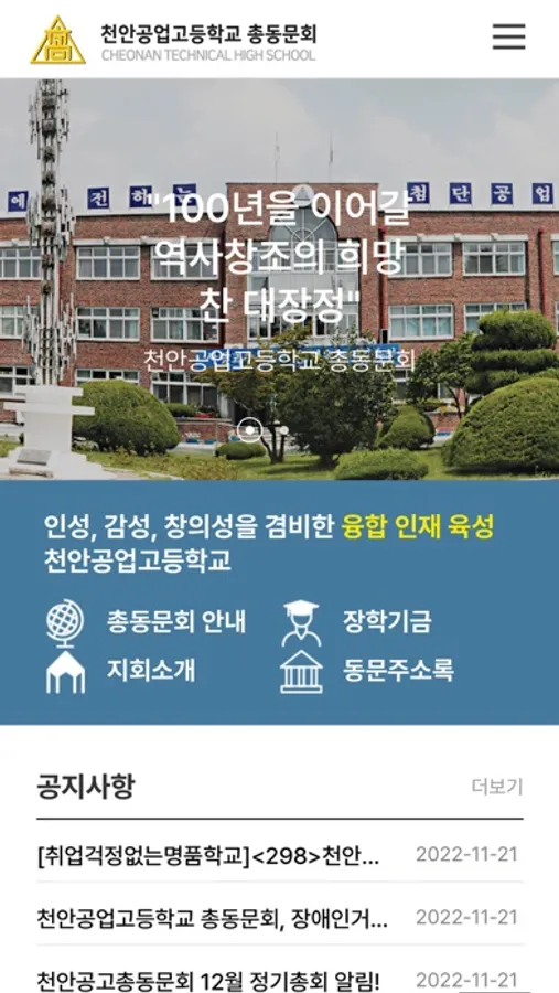 본 어플리케이션은 아산고등학교를 졸업한 모든 동문들이 자유롭게 이용할 수 있으며, 총동문회 소개 및 공지사항, 모교 소식, 행사 안내, 동문 경조사, 동문 기업 소개 등 천안공고 동문 회원 간의 자유로운 소통과 네트워크 강화를 지원합니다.