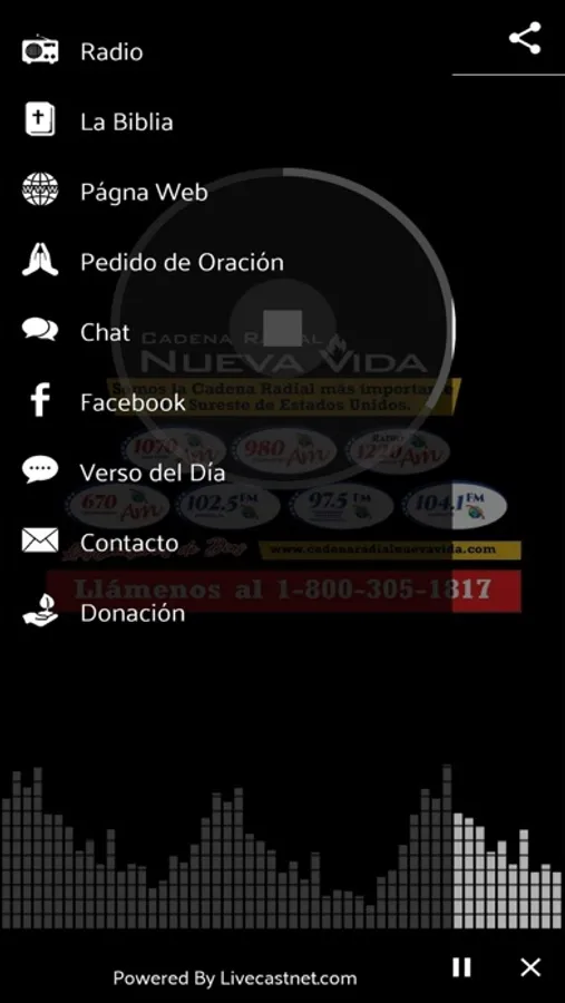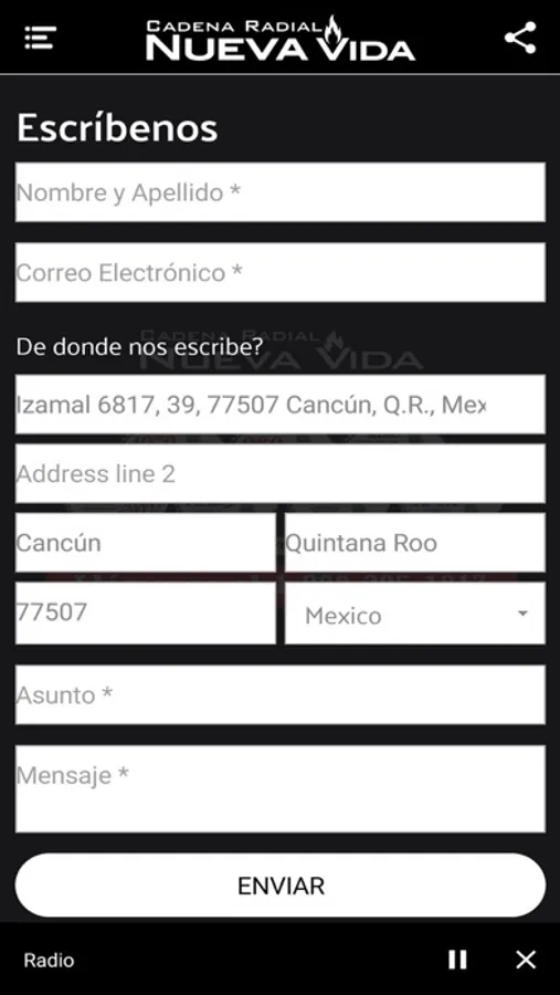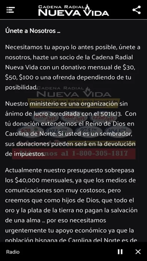 Con esta aplicación tendrás la oportunidad de escuchar Cadena Radial Nueva Vida y podrás vivir nuestros servicios, realizar pedidos de oración, leer la Biblia en texto o audio. Nuestro deseo no es solo compartir la verdad de Dios sino mostrar la aplicación para su vida diaria. ¡Benefíciese de lecciones para matrimonios, padres, finanzas, cómo mejorar sus relaciones, cómo acercarse a Dios, cómo lograr sus metas, cómo administrar sus vidas y muchas más!